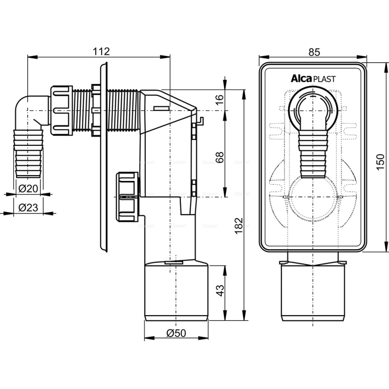Сифон для стиральной машины под штукатурку, 50 х 23/20 мм, нерж. сталь